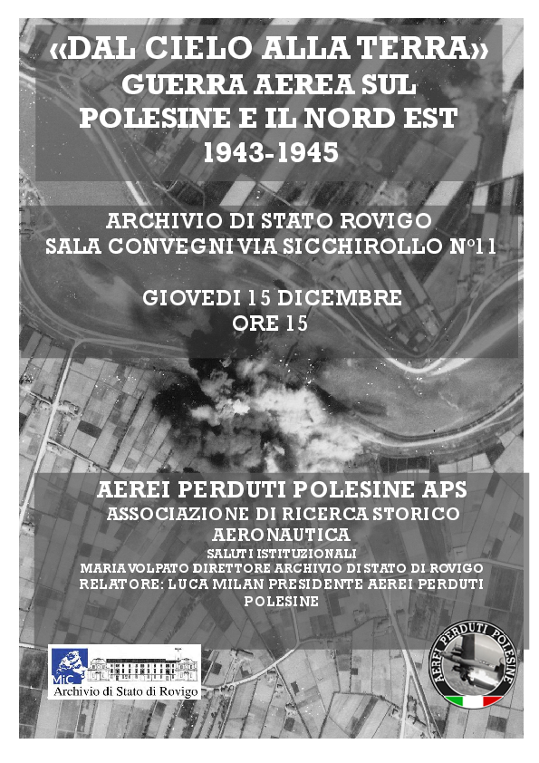 Giovedì 15 dicembre alle ore 15.00 presso la sala convegni dell’Archivio di Stato di Rovigo, “Aerei Perduti Polesine”, nella relazione “Dal cielo alla Terra Guerra Aerea sul nord est 1943 – 1945”, curata dal presidente Luca Milan, si presenterà una analisi di quella che è stata la guerra aerea sul nostro Polesine e la valle del Po, analisi frutto di anni di studio sui velivoli precipitati sul territorio, le loro missioni e i reparti di appartenenza. L'esposizione comprenderà una disamina delle modalità di ricerca della associazione che partono inequivocabilmente dallo studio di documenti storico archivistici per passare successivamente alla ricerca di testimonianze orali o scritte fino a concludersi, ove possibile, con la ricerca sul campo finalizzata al recupero di eventuali reperti.