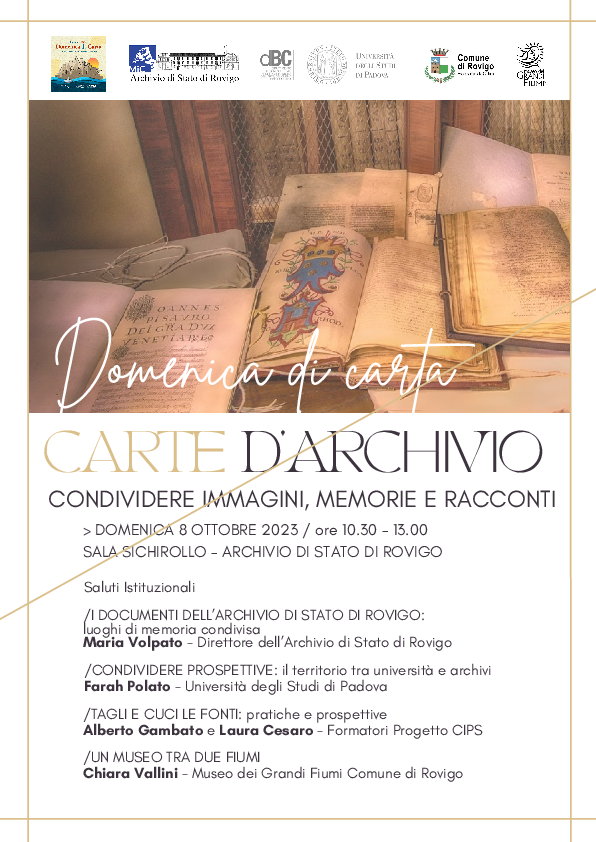 L’Archivio di Stato di Rovigo, per l’occasione, apre le porte e invita la cittadinanza a Carte d’Archivio: condividere immagini, memorie e racconti, in aperto dialogo con il Dipartimento dei Beni Culturali dell’Università degli Studi di Padova e il Museo dei Grandi Fiumi – Comune di Rovigo. A partire dalle ore 10.30, i partecipanti alla tavola rotonda si confronteranno sulle pratiche e sugli approcci possibili di valorizzazione e preservazione del patrimonio culturale e archivistico attraverso l’audiovisivo e l’educazione mediale.