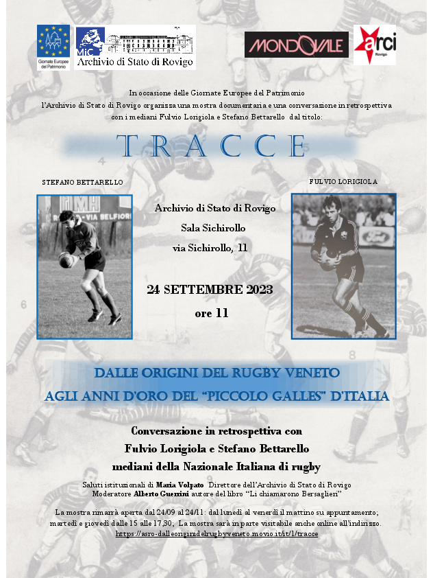 Organizzato in collaborazione con MondOvale Centro Studi e Documentazione di Rovigo e Arci Rovigo, l’incontro prende spunto dalle ricerche condotte da Alberto Guerrini, autore del libro “Li chiamarono Bersaglieri” (2022, Piazza Editore), per volgere uno sguardo retrospettivo al rugby veneto dalle origini fino ai grandi risultati sportivi ottenuti da Rovigo, Padova e Treviso negli ultimi 40 anni. La conversazione sarà aperta dai saluti del Direttore dell’Archivio di Stato di Rovigo, dr.ssa Maria Volpato, e vedrà come ospiti Stefano Bettarello, rodigino, e Fulvio Lorigiola, padovano, già mediani della nazionale italiana di rugby.