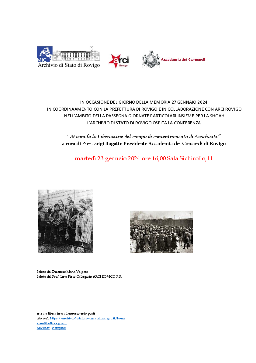 In occasione delle celebrazioni per il Giorno della Memoria 2024, istituito in memoria delle vittime dell’Olocausto e coordinate dalla Prefettura di Rovigo, l’Archivio di Stato di Rovigo in collaborazione con Arci Rovigo, nell’ambito della rassegna Giornate particolari Insieme per la Shoah ospita martedì 23 gennaio 2024 ore 16,00 Sala Sichirollo,11 la conferenza dal titolo “79 anni fa la Liberazione del campo di concentramento di Auschwitz”.