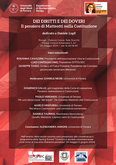 Sarà un'occasione per mettere a confronto illustri giuristi sull'influenza che ha avuto il pensiero giuridico di Matteotti nei riflessi della nostra Carta costituzionale varata a 24 anni dal suo barbaro assassinio. Parteciperanno all'incontro alcuni docenti dell'Ateneo estense, un ex Magistrato d cassazione e rappresentanti di "Movimento Nonviolento". L'evento prelude alla Spring School organizzata dal 31 maggio al 5 giugno dallo stesso Ateneo nelle due sedi di Ferrara e di Rovigo dal titolo: "Giustizia e società contemporanea - sulle orme di Giacomo Matteotti penalista".